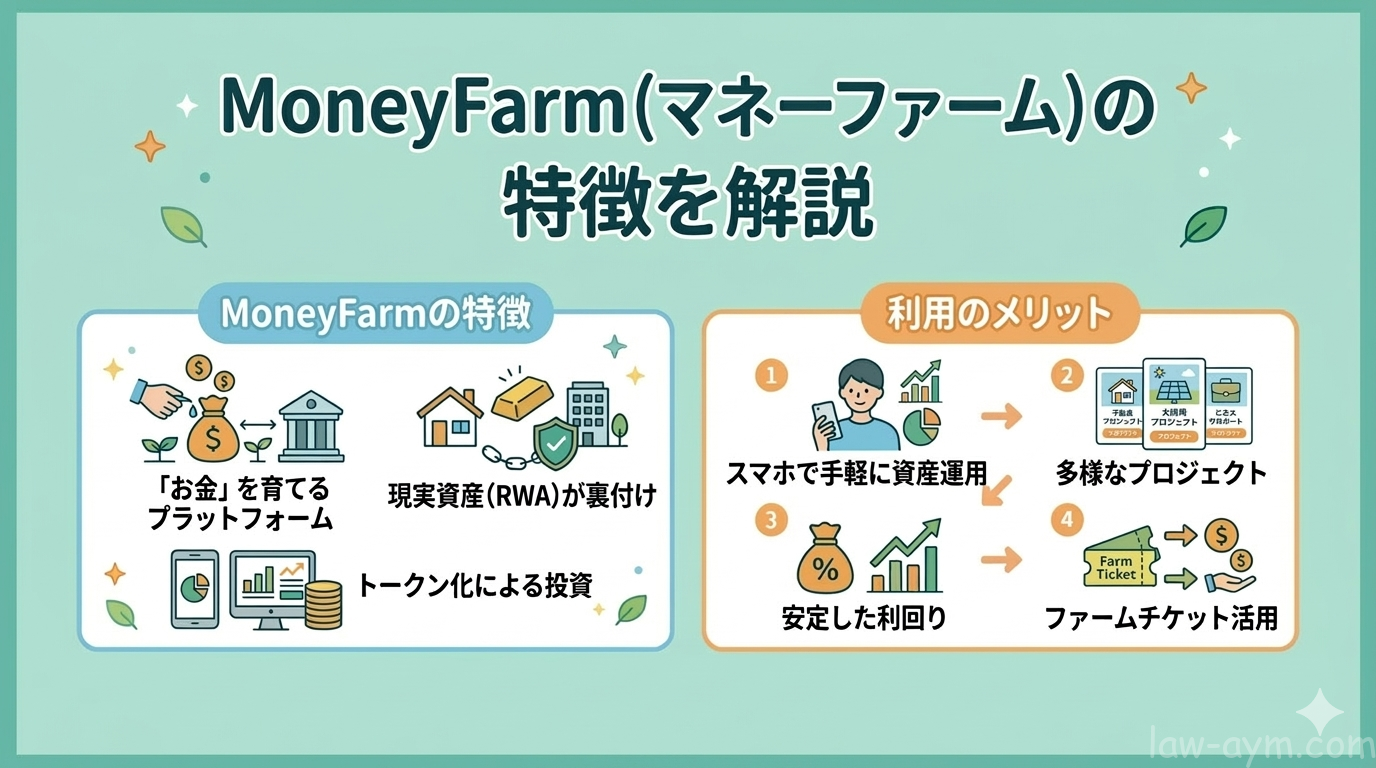 本来、企業間の金銭債権(将来お金を受け取ることができる権利)への投資は高額な資金が必要でしたが、Money Farmはこれを小口化(1万円から)トークン化することで、個人投資家が手軽に参加できる仕組みとなっています。